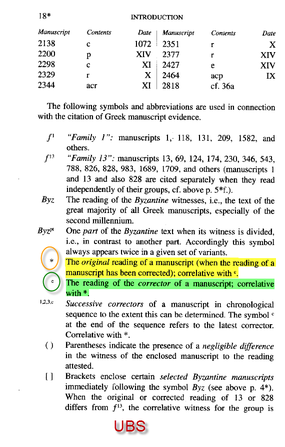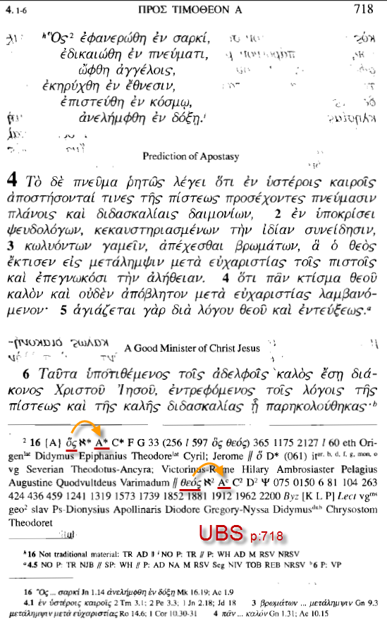 الحقيقة أنه لم يكن شيئاً من ذلك أبدا، الرمز (A) الذى يشير إلى المخطوطة السكندرية عندما يوضع أمام قراءة الذى (ος) يوضع أعلى الرمز هذه العلامة (*)، والتى تُعنى أن تلك هى القراءة الأصلية فى المخطوطة السكندرية، وعندما يوضع أمام قراءة الله (θεός) يوضع أعلاه هذه العلامة (C)، والتى تُعنى أن هذه القراءة هى من وضع ناسخ لاحق فى نص المخطوطة السكندرية.