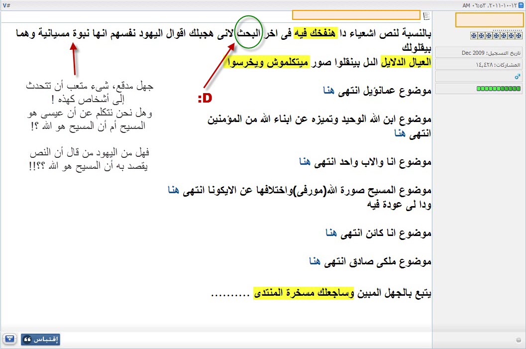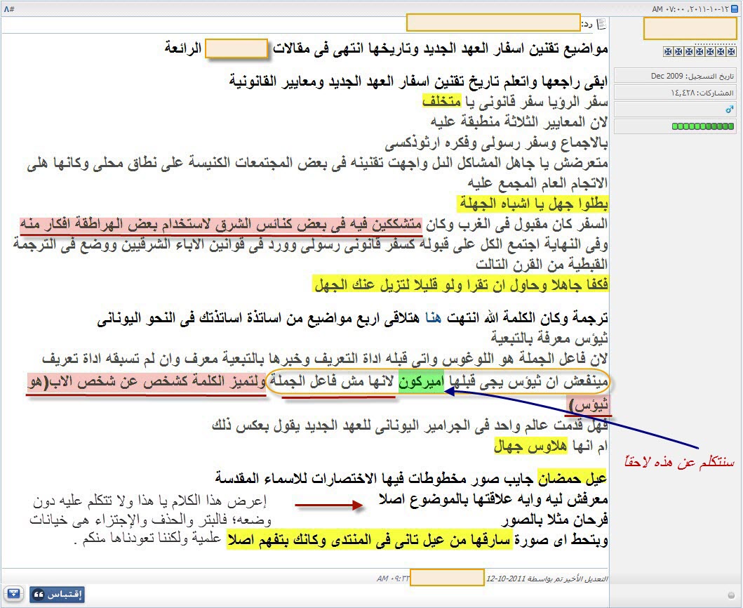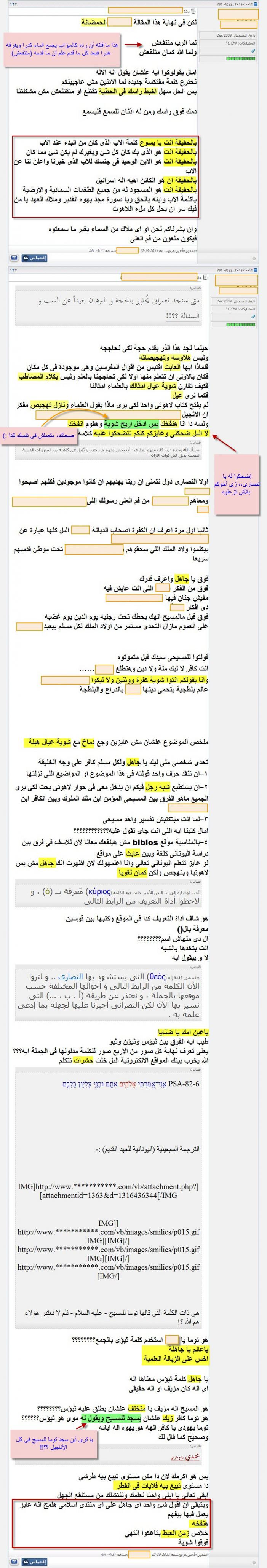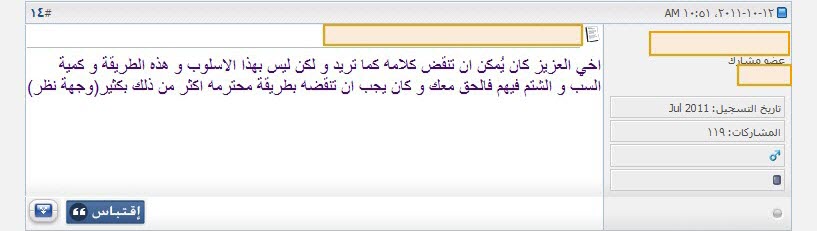 أحب أن أعلق هنا على نقاط بسيطة بعيداً عن اسلوبه الغريب الذى يحتاج أن يُعرَض لأجله على طبيب نفسانى، وبعيداً أيضاً عن استمرارية بقاء السب والشتم والوقاحة على صفحات منتداه، وما أخفيته كان أعظم، فهذا أمرٌ متوقع من هؤلاء، فلم يفتحوا تلك المواقع والمنتديات إلا لذلك.