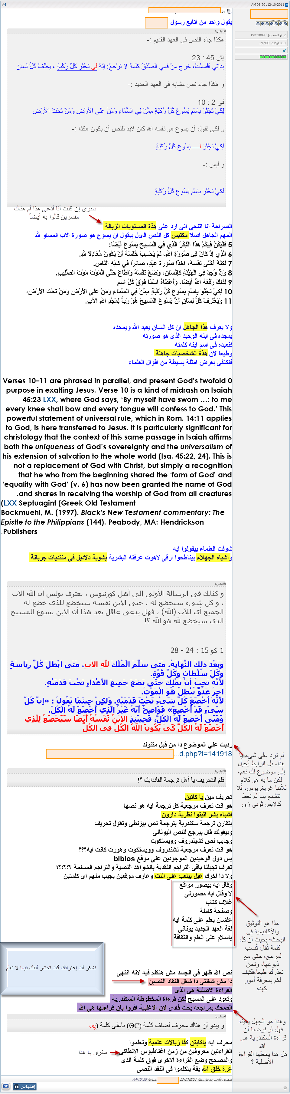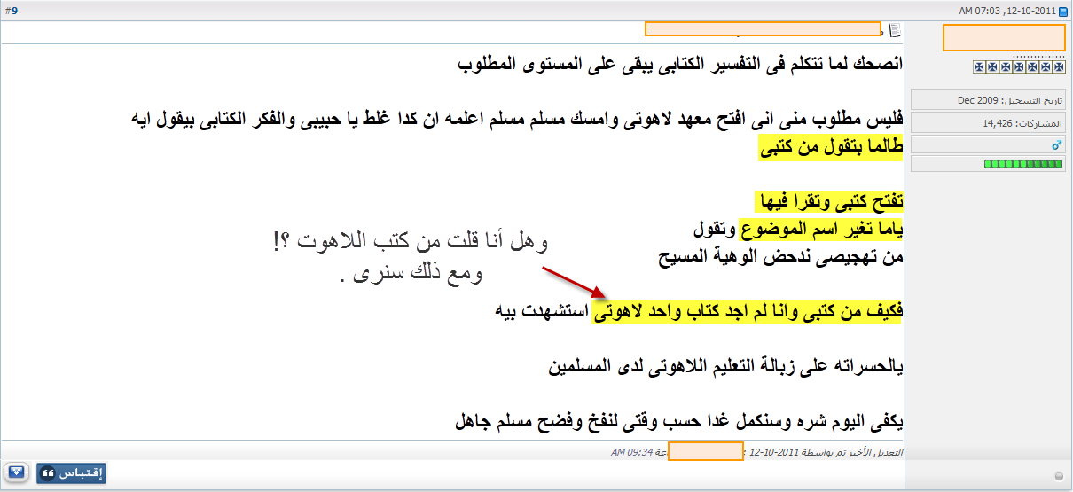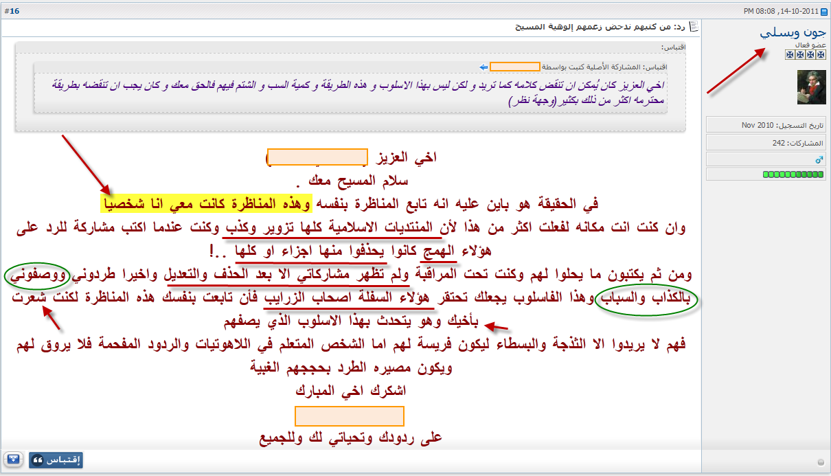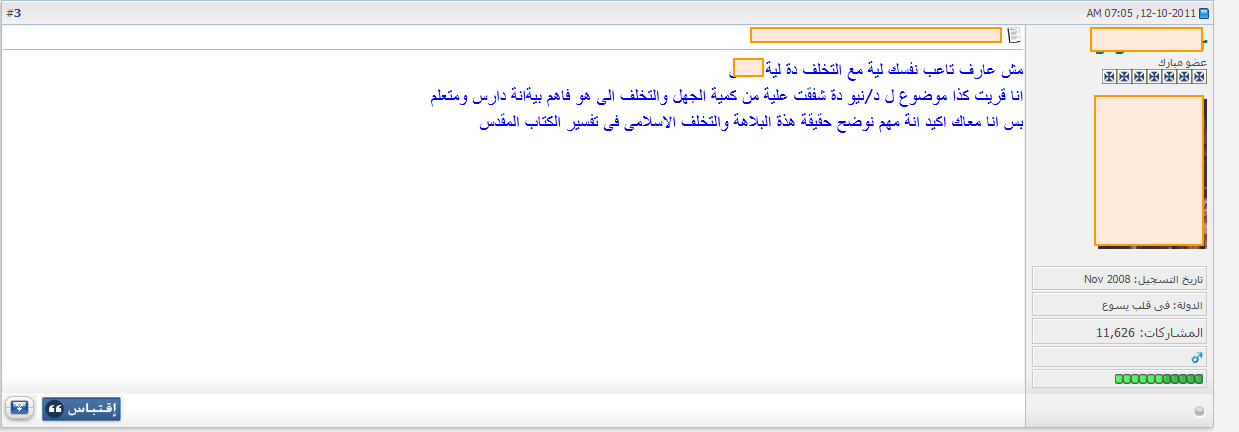 أحب أن أعلق هنا على نقاط بسيطة بعيداً عن اسلوبه الغريب الذى يحتاج أن يُعرَض لأجله على طبيب نفسانى، وبعيداً أيضاً عن استمرارية بقاء السب والشتم والوقاحة على صفحات منتداه، وما أخفيته كان أعظم، فهذا أمرٌ متوقع من هؤلاء، فلم يفتحوا تلك المواقع والمنتديات إلا لذلك.