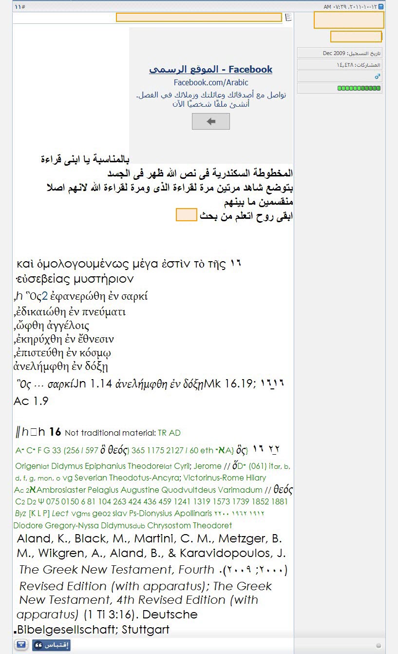 θεος) وقراءة الذى (ος) فى نص: "عظيم هو سر التقوى الله ظهر فى الجسد" 1 تيموثاوس 3 : 16[الفاندايك]: