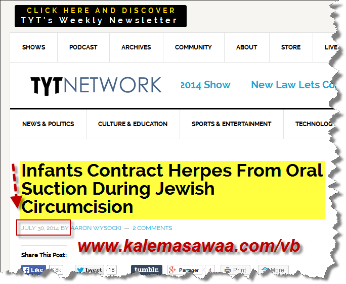 مرض Herpes يتربّص بصبية اليهود عند كلّ طقس ختان ! المصدر : https://www.tytnetwork.com/2014/07/3...-circumcision/ |