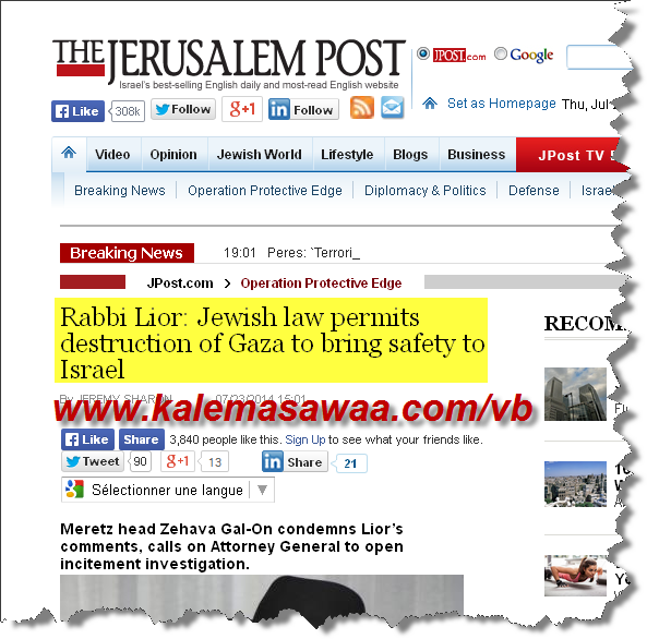 ![]() اللهم صل على محمد وعلى آله وصحبه أجمعين إستنادا لوصايا الكتاب حاخام يهودي يُجيز إبادة المدنيين و ترويع الآمنين خلال الحروب ! حزقيال 9 : 6 الشيخ والشاب والعذراء والطفل والنساء اقتلوا للهلاك =============== ================== ======================= نقرأ في مقال لصحيفة الــ jpost : ![]() شريعة اليهود تُجيز تدمير غزة حفاظا على أمن إسرائيل ! تضيف الصحيفة نقلا عن الحاخام المتطرّف : زمن الحرب الأمّة التي ( تتعرّض للهجوم ) مسموح لها بـمعاقبة مواطني العدو بما تراه مناسبا مثل إيقاف الدعم ، قطع الكهرباء ، قصف المنطقة بأكملها وفقا لتقديرات الجيش و يُراعى في ذلك عدم تعريض سلامة الجنود اليهود للخطر مع اتخاذ الإجراءات الكفيلة بسحق و إبادة العدو .