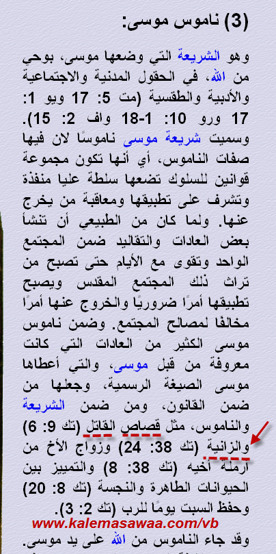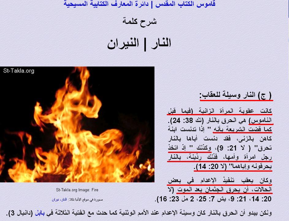 بارك الله فيكَ أخي و أستاذي الحبيب ، وجب التنويه فقط ان عقوبة حرق الزانية كان معمولا بها في إطار ما يسمى ناموس الطبيعة - نفس الناموس الذي حوكمت به ثامار جدة يسوع الزانية - قبل أن تسجل كتابة ضمن ناموس موسى النبي : ![]()