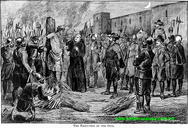 الموت حرقا للنساء ! ![]() العقاب ذاته كان جزاء كل( هرطوقي ) يُبدي رأيا مخالفا لتعاليم الكنيسة ! ![]() الصورة أعلاه نقلا عن المكتبة البريطانية the british library أدناه مشهد يوثّق لعملية إعدام Atahualpa إمبراطور الأنكا :