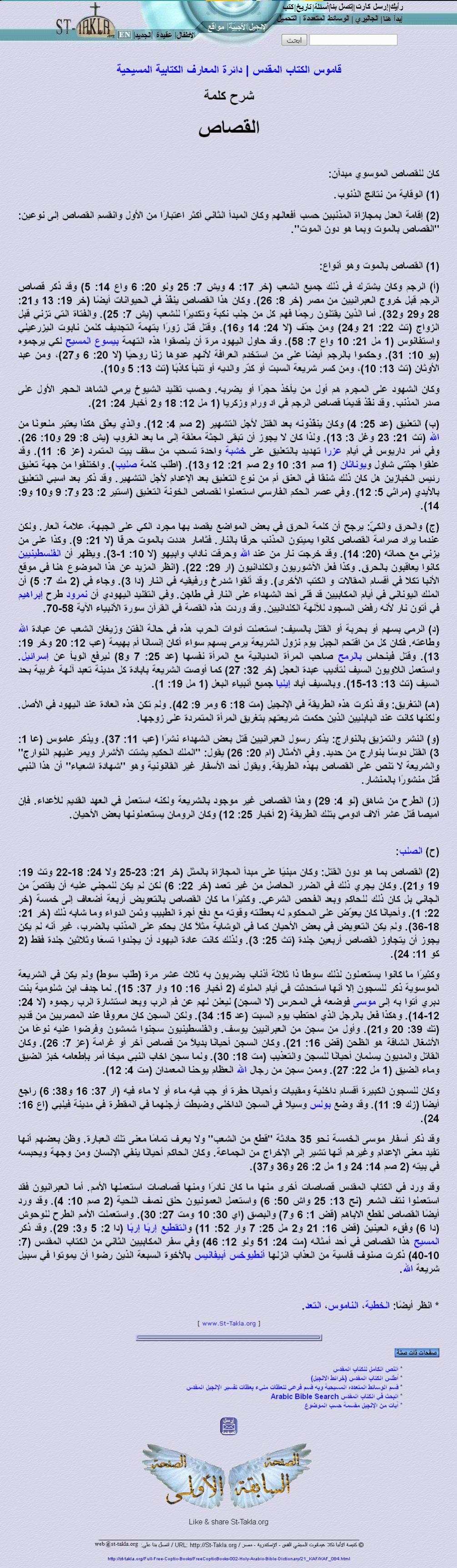 القَصاص كان للقصاص الموسوي مبدآن: (1) الوقاية من نتائج الذنوب. (2) إقامة العدل بمجازاة المذنبين حسب أفعالهم وكان المبدأ الثاني أكثر اعتبارًا من الأول وانقسم القصاص إلى نوعين: "القصاص بالموت وبما هو دون الموت". (1) القصاص بالموت وهو أنواع: (أ) الرجم وكان يشترك في ذلك جميع الشعب (خر 17: 4 ويش 7: 25 ولو 20: 6 واع 14: 5) وقد ذكر قصاص الرجم قبل خروج العبرانيين من مصر (خر 8: 26). وكان هذا القصاص ينفّذ في الحيوانات أيضًا (خر 19: 13 و21: 28 و29 و32). أما الذين يقتلون رجمًا فهم كل من جلب نكبة وتكديرًا للشعب (يش 7: 25). والفتاة التي تزني قبل الزواج (تث 22: 21 و24) ومن جدّف (لا 24: 14 و16). وقتل قتل زورًا بتهمة التجديف كلمن نابوت اليزرعيلي واستفانوس (1 مل 21: 10 واع 7: 58). وقد حاول اليهود مرة أن يلصقوا هذه التهمة بيسوع المسيح لكي يرجموه (يو 10: 31). وحكموا بالرجم أيضًا على من استخدم العرافة لأنهم عدوها زنًا روحيًا (لا 20: 6 و27)، ومن عبد الأوثان (تث 13: 10)، ومن كسر شريعة السبت أو كدّر والديه أو تنبأ كاذبًا (تث 13: 5 و10). وكان الشهود على المجرم هم أول من يأخذ حجرًا أو يضربه. وحسب تقليد الشيوخ يرمي الشاهد الحجر الأول على صدر المذنب. وقد نفّذ قديمًا قصاص الرجم في اد ورام وزكريا (1 مل 12: 18 و2 أخبار 24: 21). (ب) التعليق (عد 25: 4) وكان ينفّذونه بعد القتل لأجل التشهير (2 صم 4: 12). والذي يعلّق هكذا يعتبر ملعونًا من الله (تث 21: 23 وغل 3: 13). ولذا كان لا يجوز أن تبقى الجثة معلقة إلى ما بعد الغروب (يش 8: 29 و10: 26). وفي أمر داريوس في أيام عزرا تهديد بالتعليق على خشبة واحدة تسحب من سقف بيت المتمرد (عز 6: 11). وقد علقوا جثتي شاول ويوناثان (1 صم 31: 10 و2 صم 21: 12 و13). (اطلب كلمة صليب). واختلفوا من جهة تعليق رئيس الخبازين هل كان ذلك شنقًا في العنق أم من نوع التعليق بعد الإعدام لأجل التشهير. وقد ذكر بعد اسبي التعليق بالأيدي (مراثي 5: 12). وفي عصر الحكم الفارسي استعملوا لقصاص الخونة التعليق (استير 2: 23 و7: 9 و10 و9: 14). (ج) والحرق والكيّ: يرجح أن كلمة الحرق في بعض المواضع يقصد بها مجرد الكي على الجبهة، علامة العار. ولكن عندما يراد صرامة القصاص كانوا يميتون المذنب حرقًا بالنار. فثامار هددت بالموت حرقًا (لا 21: 9). وكذا على من يزني مع حماته (20: 14). وقد خرجت نار من عند الله وحرقت ناداب وابيهو (لا 10: 1-3). ويظهر أن الفلسطينيين كانوا يعاقبون بالحرق. وكذا فعل الآشوريون والكلدانيون (ار 29: 22). (انظر المزيد عن هذا الموضوع هنا في موقع الأنبا تكلا في أقسام المقالات و الكتب الأخرى). وقد ألقوا شدرخ ورفيقيه في النار (دا 3). وجاء في (2 مك 7: 5) أن الملك اليوناني في أيام المكابيين قد قلى أحد الشهداء على النار في طاجن. وفي التقليد اليهودي أن نمرود طرح إبراهيم في أتون نار لأنه رفض السجود للآلهة الكلدانيين. وقد وردت هذه القصة في القرآن سورة الأنبياء الآية 58-70. (د) الرمي بسهم أو بحربة أو القتل بالسيف: استعملت أدوات الحرب هذه في حالة الفتن وزيغان الشعب عن عبادة الله وطاعته. فكان كل من اقتحم الجبل يوم نزول الشريعة يرمى بسهم سواء أكان إنسانًا أم بهيمة (عب 12: 20 وخر 19: 13). وقتل فينحاس بالرمح صاحب المرأة المديانية مع المرأة نفسها (عد 25: 7 و8) ليرفع الوبأ عن إسرائيل. واستعمل اللاويون السيف لتأديب عبدة العجل (خر 32: 27) كما أوصت الشريعة بابادة كل مدينة تعبد آلهة غريبة بحد السيف (تث 13: 13-15). وبالسيف أباد إيليا جميع أنبياء البعل (1 مل 19: 1). (هـ) التغريق: وقد ذكرت هذه الطريقة في الإنجيل (مت 18: 6 ومر 9: 42). ولم تكن هذه العادة عند اليهود في الأصل. ولكنها كانت عند البابليين الذين حكمت شريعتهم بتغريق المرأة المتمردة على زوجها. (و) النشر والتمزيق بالنوارج: يذكر رسول العبرانيين قتل بعض الشهداء نشرًا (عب 11: 37). ويذكر عاموس (عا 1: 3) القتل دوسًا بنوارج من حديد. وفي الأمثال (ام 20: 26) يقول: "الملك الحكيم يشتت الأشرار ويمر عليهم النوارج" والشريعة لا تنص على القصاص بهذه الطريقة. ويقول أحد الأسفار غير القانونية وهو "شهادة اشعياء" أن هذا النبي قُتل منشورًا بالمنشار. (ز) الطرح من شاهق (لو 4: 29) وهذا القصاص غي