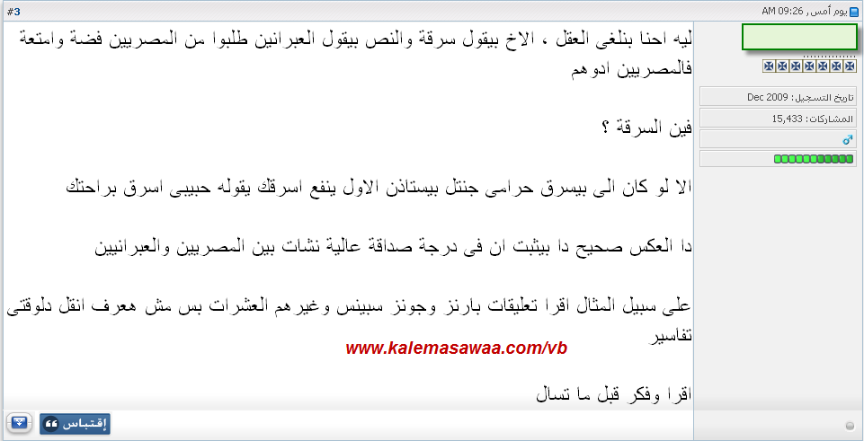 لسان العرب اللي جنابك بتستشهد بيه بيقول : معنى سلب في لسان العرب سَلَبَه الشيءَ يَسْلُبُه سَلْباً وسَلَباً واسْتَلَبَه إِياه وسَلَبُوتٌ فَعَلوتٌ مِنه وقال اللحياني رجل سَلَبوتٌ وامرأَةٌ سَلَبوتٌ كالرجل وكذلك رجلٌ سَلاَّبةٌ بالهاءِ والأُنثى سَلاَّبة أَيضاً والاسْتِلابُ الاختِلاس و إليكَ المزيد من معاني كلمة سلب : معجم المعاني الجامع : سلَب فلانًا مالَه / سلَب منه مالَه : انتزعه قهرًا أو اختلاسًا الوسيط : اسْتَلَبَهُ : سلبه. ويقال: استلبَه إيَّاه تاج العروس : سَلَبَه الشيءَ يَسْلُبُه سَلْباً : اخْتَلَسه كاسْتَلَبَه إِيَّاهُ . الصحاح : سلبت الشيء سَلْباً. والاستلابُ: الاختلاس. لأننا أمّة الدّليل ،بإمكانك تراجع ورايا أنقر : هـُنا و هُــنا نص خروج 3 : 22 ترجمة : Complete Jewish Bible بيقول : all the women will ask their neighbors and house guests for silver and gold jewelry and clothing, with which you will dress your own sons and daughters. In this way you will plunder the Egyptians الكلمة المستعملة للدلالة على السرقة والنصب باستعمال الحيلة و الخداع هي plunder و الشرح بتاعها أهه على الرابط المسيحي : http://biblehub.com/topical/p/plunder.htm وزي ما جنابك شايف الكلمات الآتية كلها مرادفات للسرقة و النهب سواء عنوة أو عن طريق الإحتيال و الخداع fraud : pillage roberry fraud theft يضيف منصّر ثان : المنصّر أعلاه يقول : ما فعله العبرانيون لا يُعتبر جريمة ، ما أخذوه من المصريين هو بمثابة إستحقاق أو تعويض عن سنوات العبودية التي عاشوها بمصر . يعني طبقا لمنطق المنصّر السقيم العليل يجوز الآن لأي أميركي من أصول أفريقية أن يسرق البنك المركزي بالولايات المتحدة و أيضا بالبرازيل كإستحقاق و تعويض عن سنوات الإستعباد و التسخير التي عاشها أسلافه بعد نقلهم كعبيد إلى الأمريكيتين ! ![]() يُتبع ...... للمزيد من مواضيعي