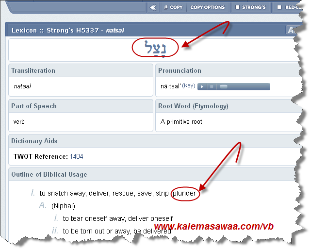 1- القاموس اللي جنابك بتستشهد بيه بيقول : العبرانيون سرقوا و نهبوا المصريين ! من بين معاني كلمة spoil : spoil -------> نهب pillage plunder -------> شرحناها أعلاه و قلنا إن معناها هو السرقة والنهب سواء عنوة أو عن طريق الإحتيال و الخداع fraud ![]() المنصّر طبعا في خضم تدليسه أخفى عن عيون المريدين و الأتباع حقيقة كون القاموس ذاته اللي استشهد بيه يقول : נצל = plunder ![]() يُتبع ......... |