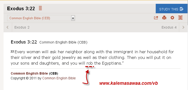 نص خروج 22:3 ترجمة CEBيقول : معبود الكنيسة يأمر العبرانيين بسرقة أموال المصريين ! الكلمة المستعملة هي rob ،