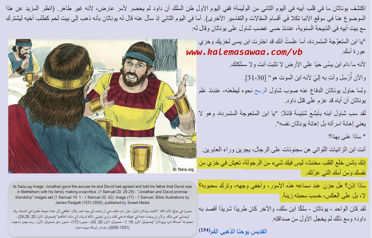نقرأ من : تفسير الكتاب المقدس - العهد القديم - القمص تادرس يعقوب سلسلة "من تفسير وتأملات الآباء الأولين" صموئيل الأول 20 - تفسير سفر صموئيل أول يوناثان ينقذ داود ولما حاول يوناثان الدفاع عنه صوب شاول الرمح نحوه ليطعنه، عندئذ علم يوناثان أن أباه قد عزم على قتل داود. لقد سب شاول ابنه بأبشع شتيمة قائلًا: "يا ابن المتعوجة المتمردة، وهو لا يعني إهانة امرأته بل إهانة يوناثان نفسه". * ماذا عَنَى بهذا؟ أنت ابن الزانيات اللواتي هن مجنونات على الرجال، يجرين وراء العابرين. إنك بائس خلع القلب مخنث، ليس فيك شيء من الرجولة، تعيش في خزي من نفسك ومن أمك التي عرّتك. ماذا إذن؟ هل حزن عند سماعه هذه الأمور، وأخفى وجهه، وترك محبوبه؟ لا، بل على العكس، حَسِبَ محبته زينة. لقد كان الواحد - يوناثان - ملكًا ابن ملك، والآخر كان طريدًا شريدًا أقصد به داود؛ ومع ذلك لم يخجل الأول من صداقته. ![]() المصدر من هُنا |