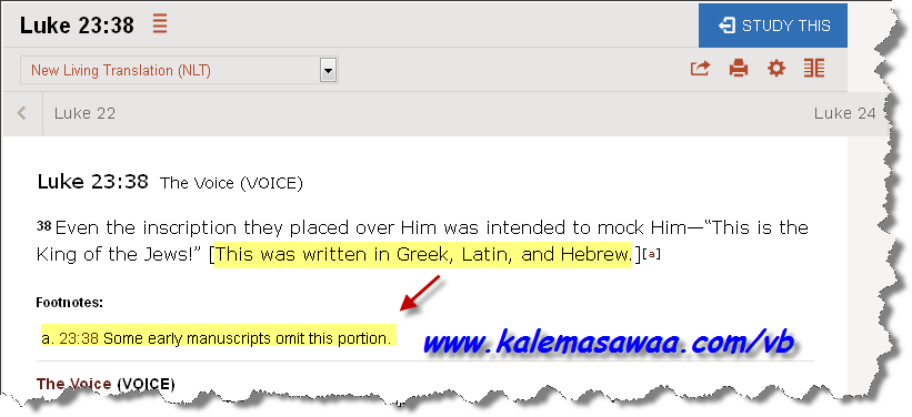 ترجمة the voice تـُقرّ بالتلاعب بنصّ لوقا 38 : 23 حيث تقول في الهامش بأن بعض المخطوطات أخفت عبارة : مَكْتُوبٌ بِأَحْرُفٍ يُونَانِيَّةٍ وَرُومَانِيَّةٍ وَعِبْرَانِيَّةٍ !