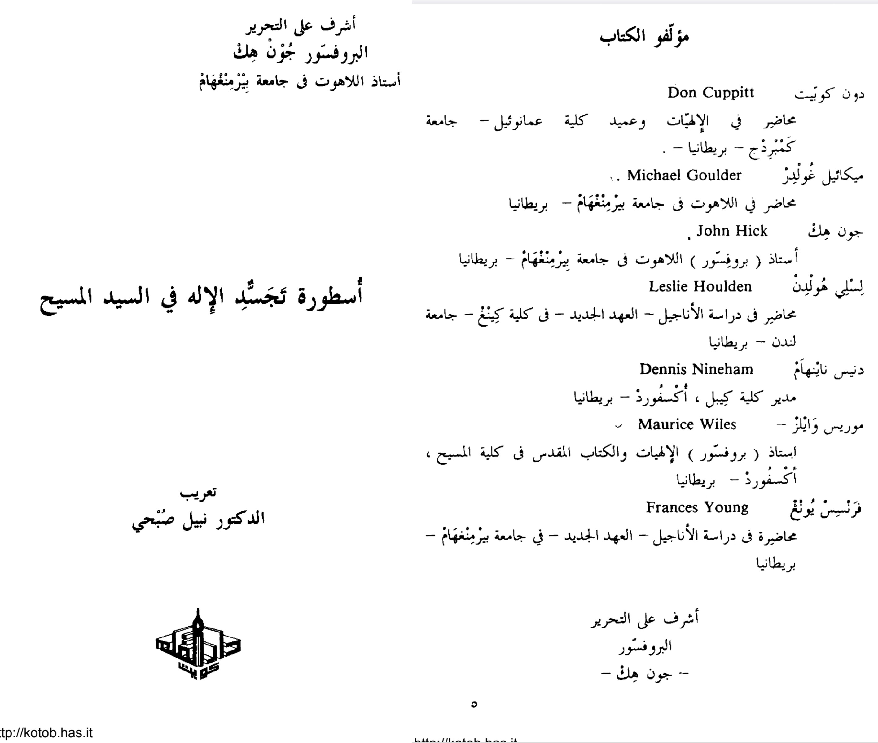 بسم الله الرحمن الرحيم و به نستعين هناك بعد الكلمات القليلة غير دقيقة فى الترجمة سيلاحظها المتمرس ما أعجبني فى هذا الكتاب هو زيادة يقيني بأنّ المسلم كلما تعمق فى عقائده زاد إيمانه أما النصراني كلما تعمق فى عقائده أنكرها القراءة و التحميل من الروابط التالية كتاب أُسطورة تجسد الإله فى المسيح كتاب أُسطورة تجسد الإله فى المسيح The Myth of God Incarnate للمزيد من مواضيعي