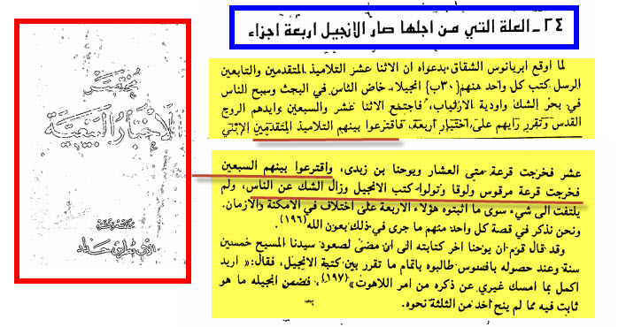 سلسلة قرأت لكم هى سلسلة تنشر بعض أقوال علماء النصارى من كتب تراثيه لم تنشر بعد من هذه الاقوال ما يرد شبهات تثار الان حول الاسلام أو نبى الاسلام محمد صلى الله عليه وسلم ومنها ما يخالف ما يعتقده النصارى اليوم , ومنها ما يخالف فهم النصارى فى بعض المعتقدات ... الكتاب الرابع : مختصر الاخبار البيعيه الغلاف ![]() العله التى لاجلها صار الانجيل الواحد أربع اناجيل .. ![]() كلام المؤلف عن وفاة مريم ... ![]() أهل الكهف من المرجع النصرانى ![]() هل سمع منكم شيئا عن رسالة بولس لاهل مصر ؟ ![]() سبب كتابة إنجيل لوقا هى كثرة الاناجيل أنذاك ... ![]() شاهد صفات يعقوب أخو الرب ... ![]() لماذا كتب القديس متى إنجيله ؟ ![]() للمزيد من مواضيعي