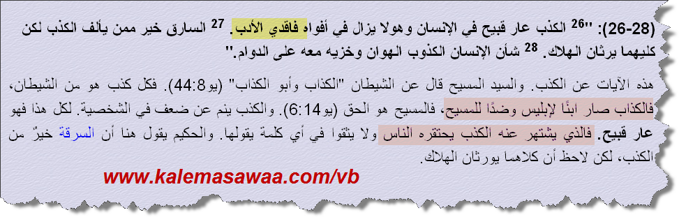 ![]() المفارقة الغريبة العجيبة كون الهولي بايبل نفسه يُفيد بكون الكذب عار قبيح في الإنسان و محترف الكذب ليس فاقد أدب وحسب بل و ابن شيطان أيضاً !!!؟؟؟ ![]() أدناه تفسير عجائبي بقلم القس أنطونيوس فكري : تفسير سفر يشوع بن سيراخ :