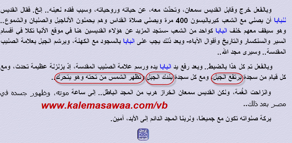![]() اللهم صل على محمد وعلى آله وصحبه أجمعين ،، يستند المـُرجف على قوله تعالى في سورة الأعراف : (( وَإِذْ نَتَقْنَا الْجَبَلَ فَوْقَهُمْ كَأَنَّهُ ظُلَّةٌ وَظَنُّوا أَنَّهُ وَاقِعٌ بِهِمْ خُذُوا مَا آتَيْنَاكُم بِقُوَّةٍ وَاذْكُرُوا مَا فِيهِ لَعَلَّكُمْ تَتَّقُونَ 171 )) ليطعن بالباطل العاطل في الوحي الإلهي الصّادق . المنصّر البائس يعتبر رفع ربّ العزّة للجبل فوق رؤوس بني إسرائيل نوعاً من الخرافة و يُطالبنا عليه بالدّليل من كتب التّاريخ ! للرّد على هذه الشّبهة الواهية نقول : أوّلاَ : هل عدم ذكر الحادثة في كتب التّاريخ دليل على عدم حدوثها ؟؟؟ ![]() ثانياً : أحبار اليهود سمعوا الآية الكريمة تُتلى آناء الليل و أطراف النّهار بين ظهرانيهم فهل اعترض منهم أحد على الواقعة !!! ![]() ثالثاً : بدورنا نُريد إعترافاً موثّقاًً بقلم المؤرّخين الذين عايشوا فترة خروج العبرانيين من مصر ، أحصوا ودوّنوا جميع تنقّلاتهم و أفادوا في نهاية الأمر بأنّ هذه الحادثة - رفع الجبل - لم تقع أبداً . فمن يُفيدنا بالخبر ؟؟؟؟ ![]() رابعاً : لو إطلّع المنصّر البائس على تفاسيرنا ما افترى وبلغ ضراطه عنان السّماء فربّ العزّة خالقنا لا يُعجزه شيء لا في السّماء و لا في الأرض : اذكر يا محمد وذكّر بنى إسرائيل المعاصرين لك وقت أن رفعنا الجبل فوق آبائهم الذين كانوا في عهد موسى حتى صار كأنه غمامة أو سقيفة فوق رءوسهم لنريهم آية من الآيات التي تدل على قدرتنا وعلى صدق نبينا موسى- عليه السلام-. قال بعض العلماء: «ورفع الجبل فوقهم لإرشادهم آية من آيات الله تقوى إيمانهم بأن التوراة منزلة من عند الله، وقوة الإيمان من شأنها أن تدفع إلى العمل بما في الكتاب المنزل بجد واجتهاد . ( التفسير الوسيط لطنطاوي ) من باب : (( جَاوِبِ الْجَاهِلَ حَسَبَ حَمَاقَتِهِ لِئَلاَّ يَكُونَ حَكِيمًا فِي عَيْنَيْ نَفْسِهِ. أمثال 26 : 5 )) نقول : هلاّ فتّش النّصراني كتابه كما امره معبوده قبل أن يطعن في كتب الآخرين : أجسام طائرة عرضتها نصوص الهولي بايبل : 1- سحب نارية ظلّلت العبرانيين: ( خروج 13 : 21 ) وَكَانَ الرَّبُّ يَسِيرُ أَمَامَهُمْ نَهَارًا فِي عَمُودِ سَحَابٍ لِيَهْدِيَهُمْ فِي الطَّرِيقِ، وَلَيْلاً فِي عَمُودِ نَارٍ لِيُضِيءَ لَهُمْ. لِكَيْ يَمْشُوا نَهَارًا وَلَيْلاً. 2- مركبات و خيول نارية طائرة ( ملوك ثاني 2 : 11 ) وَفِيمَا هُمَا يَسِيرَانِ وَيَتَكَلَّمَانِ إِذَا مَرْكَبَةٌ مِنْ نَارٍ وَخَيْلٌ مِنْ نَارٍ فَصَلَتْ بَيْنَهُمَا، فَصَعِدَ إِيلِيَّا فِي الْعَاصِفَةِ إِلَى السَّمَاءِ. صورة في موقع الأنبا تكلا .صورة للفنان جوستاف دوريه، صعود إيليا النبي في مركبة نارية : المصدر 3- خبز طائر ( خروج 16 : 4 ) فَقَالَ الرَّبُّ لِمُوسَى: «هَا أَنَا أُمْطِرُ لَكُمْ خُبْزًا مِنَ السَّمَاءِ. فَيَخْرُجُ الشَّعْبُ وَيَلْتَقِطُونَ حَاجَةَ الْيَوْمِ بِيَوْمِهَا. لِكَيْ أَمْتَحِنَهُمْ، أَيَسْلُكُونَ فِي نَامُوسِي أَمْ لاَ. 4- أرض طائرة ( إرميا 48 : 9 ) أَعْطُوا مُوآبَ جَنَاحًا لأَنَّهَا تَخْرُجُ طَائِرَةً وَتَصِيرُ مُدُنُهَا خَرِبَةً بِلاَ سَاكِنٍ فِيهَا. أعطوها جناحاً = فتستطيع الهرب سريعاً ولكنها بهذا ستصير مثل الطيور التي تطير فوق الخِربْ. ( تفسير أنطونيوس فكري ) ![]() 5- جبال لم تطر بأمر من الربّ و إنما بفعل تعاويذ ورشم بابوات مسوقين بالرّوح القدس : أدناه توثيق لخرافة نقل البابا أبرام ابن زرعة لجبل المقطّم : ![]() أنقر هنا و هنا يانصارى مالي لا أسمعكم تقولون هلّلويا ؟؟؟؟؟؟ ![]() للمزيد من مواضيعي