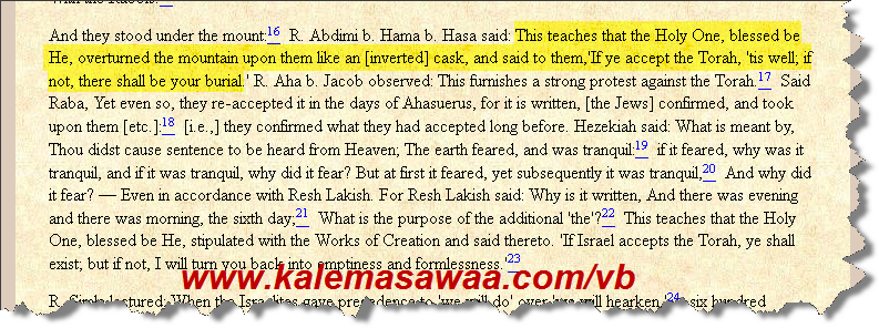 بالإضافة إلى ما تفضلت به أخى الحبيب فقصة رفع الجبل فوق بنى إسرائيل معروفة عند اليهود فى التلمود و يعرفها أحبارهم http://www.come-and-hear.com/shabbath/shabbath_88.html And they stood under the mount:16 R. Abdimi b. Hama b. Hasa said: This teaches that the Holy One, blessed be He, overturned the mountain upon them like an [inverted] cask, and said to them,'If ye accept the Torah, 'tis well; if not, there shall be your burial.' المزيد من مواضيعي