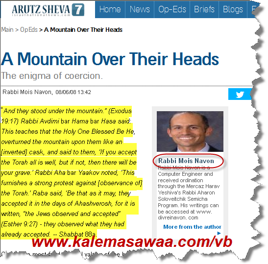 ![]() فليُعدّ المنصّرون جحورهم ! نقرأ بقلم الراباي Mois Navon A Mountain Over Their Heads The Pedagogic Value of Coercion صفحة رقم 1 : ![]() وجلسوا أسفل الجبل ( خروج 19 : 17 ) الراباي Avdimi ابن Hama إبن Hasa يقول : هذا يُعلّمنا أن الربّ القدير ( يهوه معبود الكنيسة ) رفع الجبل فوق رؤوس بني إسرائيل وقال لهم : لإن لم تقبلوا التوراة سيكون هذا الجبل قبركم !!! ![]() ![]() ![]() ![]() ![]()