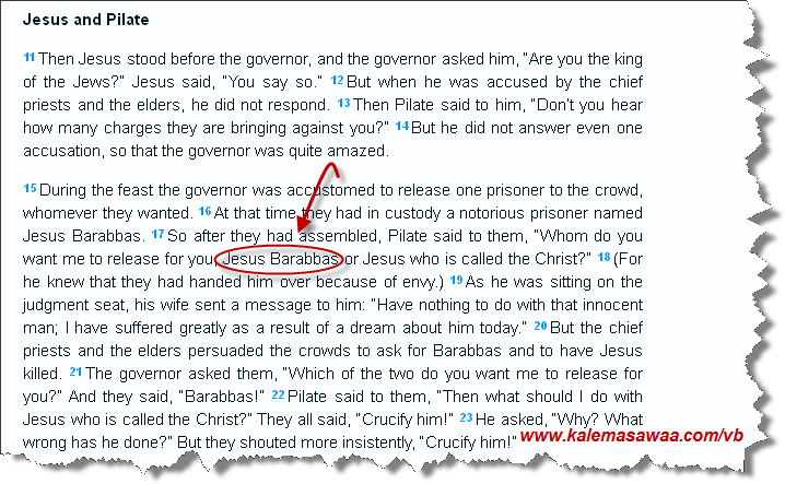 و كرأى شخصى فحسب - وليس أكثر- أظن أن ما حدث هو أن بيلاطس نظرا لتعاطفه هو و زوجته مع السيد المسيح و ربما إيمانهما سرا به قد يكون قد أطلق سراح (يسوع المسيح) و أمر بصلب (يسوع باراباس) مستغلا تشابه الأسماء حتى لا تعلم الجموع بحقيقة ما فعله حتى لا يثوروا عليه مثلا مرقس إصحاح 15: 15 وَإذْ أرادَ بِيلاطُسُ أنْ يُرضِيَ النّاسَ، أطلَقَ لَهُمْ بارَباسَ، وَأمَرَ بِأنْ يُجلَدَ يَسُوعُ، وَأسلَمَهُ لِيُصلَبَ. ربما يكون قد قال للناس أنه سيطلق باراباس حرصا على إرضاءهم ثم أمر بأن يجلد يسوع (باراباس) و أسلمه ليصلب و أطلق يسوع (المسيح) بل طبقا لإنجيل يوحنا إصحاح 19 كان بيلاطس يحاول إيجاد طريقة ليطلق بها سراح يسوع (المسيح) جاء فى يوحنا 19: فَأمَرَ بِيلاطُسُ بِأنْ يُؤخَذَ يَسُوعُ وَيُجلَدَ. 2 فَصَنَعَ الجُنُودُ تاجاً مِنَ الشَّوكِ وَوَضَعُوهُ عَلَى رَأْسِهِ، ثُمَّ ألبَسُوهُ رِداءً أُرجُوانِيَّ اللَّونِ. [a] 3 وَكانُوا يَأْتُونَ إلَيْهِ وَيَقُولُونَ: «نُحَيِّيْكَ يا مَلِكَ اليَهُودِ!» وَكانُوا يَصفَعُونَهُ. 4 ثُمَّ خَرَجَ بِيلاطُسُ ثانِيَةً وَقالَ لَهمْ: «ها أنا أُخرِجُهُ إلَيْكُمْ لِكَيْ تَعلَمُوا أنِّي لا أجِدُ ما أتَّهِمُهُ بِهِ.» 5 فَخَرَجَ يَسُوعُ لابِساً تاجَ الشَّوكِ وَالرِّداءَ الأُرجُوانِيَّ. فَقالَ لَهُمْ بِيلاطُس: «ها هُوَ الرَّجُلُ!» 6 فَلَمّا رَآهُ كِبارُ الكَهَنَةِ وَحُرّاسُ الهَيْكَلِ، صَرَخُوا: «اصلِبْهُ! اصلِبْهُ!» فَقالَ لَهُمْ بِيلاطُسُ: «أنتُمْ خُذُوهُ وَاصلِبُوهُ! فَأنا لا أجِدُ ما أتَّهِمُهُ بِهِ.» 7 فَأجابَهُ اليَهُودُ: «لَدَيْنا شَرِيْعَةٌ، وَوِفقَ شَرِيْعَتِنا يَنبَغِي أنْ يَمُوتَ هَذا، لِأنَّهُ ادَّعَى أنَّهُ ابْنُ اللهِ!» 8 فَلَمّا سَمِعَ بِيلاطُسُ هَذا خافَ كَثِيْراً. 9 فَدَخَلَ إلَى قَصْرِ الوالِي ثانِيَةً وَقالَ لِيَسُوعَ: «مِنْ أيْنَ أنتَ؟» لَكِنَّ يَسُوعَ لَمْ يُجِبْهُ. 10 فَقالَ لَهُ بِيلاطُسُ: «أتَرفُضُ أنْ تُكَلِّمَنِي؟ ألا تَعلَمُ أنَّنِي أملِكُ سُلطَةً لإخلاءِ سَبِيلِكَ، وَسُلطَةً لِصَلْبِكَ؟» 11 أجابَهُ يَسُوعُ: «ما كُنتَ لِتَملِكَ أيَّةَ سُلطَةٍ عَلَيَّ لَو لَمْ يُعطِكَ إيّاها اللهُ. لِذَلِكَ فَإنَّ خَطِيَّةَ الرَّجُلِ الَّذِي سَلَّمَنِي إلَيْكَ أعظَمُ مِنْ خَطِيَّتِكَ.» 12 بَعدَ ذَلِكَ بَدَأ بِيلاطُسُ يُحاوِلُ أنْ يَجِدَ طَرِيْقَةً لإطلاقِ يَسُوعَ. لَكِنَّ اليَهُودَ صَرَخُوا: «إنْ أطلَقْتَهُ، فَلَسْتَ مُوالِياً لِلقَيْصَرِ! فَكُلُّ مَنْ يَقُولُ إنَّهُ مَلِكٌ هُوَ عَدُوٌّ لِلقَيْصَرِ.» 13 فَلَمّا سَمِعَ بِيلاطُسُ هَذا الكَلامَ، أخرَجَ يَسُوعَ، ثُمَّ جَلَسَ عَلَى كُرسِيِّ القَضاءِ فِي مَكانٍ يُدعَى «البَلاطَ» وَبِالآرامِيَّةِ «جَبّاتا.» 14 وَكانَ ذَلِكَ ظُهْرَ يَومِ الجُمعَةِ، يَومَ الاسْتِعدادِ لِلفِصْحِ. فَقالَ بِيلاطُسُ لِليَهُودِ: «ها هُوَ مَلِكُكُمْ!» 15 فَصَرَخُوا: «أبعِدْهُ عَنّا! أبعِدْهُ! اصلِبْهُ!» فَقالَ لَهُمْ بِيلاطُسُ: «هَلْ أصلِبُ مَلِكَكُمْ؟» فَأجابَهُ كِبارُ الكَهَنَةِ: «لَيْسَ لَنا مَلِكٌ سِوَى القَيْصَرِ!» 16 حِيْنَئِذٍ سَلَّمَهُ بِيلاطُسُ إلَيْهِمْ لِكَيْ يُصلَبَ. هذه الجملة بالفعل ملفتة جدا للنظر ( 12 بَعدَ ذَلِكَ بَدَأ بِيلاطُسُ يُحاوِلُ أنْ يَجِدَ طَرِيْقَةً لإطلاقِ يَسُوعَ. ) طيب ما هو الحل ؟ بيلاطس مقتنع ببراءة المسيح و لا يريد صلبه و اليهود يهددونه أنه إن أطلقه فليس مواليا لقيصر لأن يسوع يقول أنه ملك و من يقول أنه ملك فهو عو لقيصر فمن المحتمل أن يكون بيلاطس قد أطلق يسوع (المسيح) و طالبه بأن يختفى عن أعين الناس و أمر بصلب يسوع (باراباس) و خرج و قال لليهود صلبت (يسوع) حتى لا يرفعون أمره لقيصر و تحدثنا الأناجيل أن الوقت الذى كان فيه المسيح على الصليب - طبقا للأناجيل - كان وقت كسوف للشمس كما فى مرقس 15 33 وَنَحْوَ السّاعَةِ الثّانِيَةَ عَشْرَةَ ظُهراً، خَيَّمَ الظَّلامُ عَلَى كُلِّ الأرْضِ حَتَّى السّاع