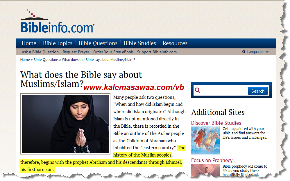 ![]() الحمدُ لله و حده ، و الصلاة و السّلام على من لا نبيّ بعده ،، نقرأ من موقع : www.bibleinfo.com تاريخ الشّعب المسلم يبتدئ مع إبراهيم النبيّ { عليه السّلام } و نسله عبر إبنه البكر إسماعيل { عليه السّلام }. ![]() المصدر للمزيد من مواضيعي