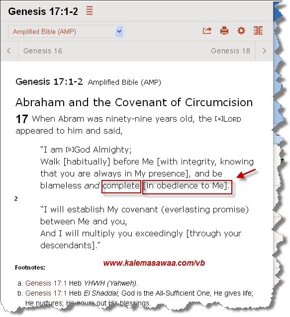 نص تكوين 17 :1 ، نسخة : Amplified Bible (AMP) When Abram was ninety-nine years old, the [a]Lord appeared to him and said, “I am [b]God Almighty; Walk [habitually] before Me [with integrity, knowing that you are always in My presence], and be blameless and complete [in obedience to Me]. يهوه يطلب من إبراهيم النبيّ عليه السّلام أن يكون كامل الطاعة ، الإنقياد و الإستسلام أمامه . ![]() أليست كلّها معاني للإسلام ؟؟؟ ![]()
