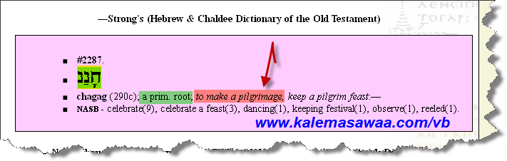 القيام بالحج إلى مكة ![]() بمقارنة الكلمة بمقابلتها الواردة في قاموس سترونغ تحت رقم : H2328 نحصل على الآتي : الجذر : / حوج / חוּג a prim. Root ومعناه : make a circle صنع دائرة ![]() ![]() ![]() للمزيد من مواضيعي