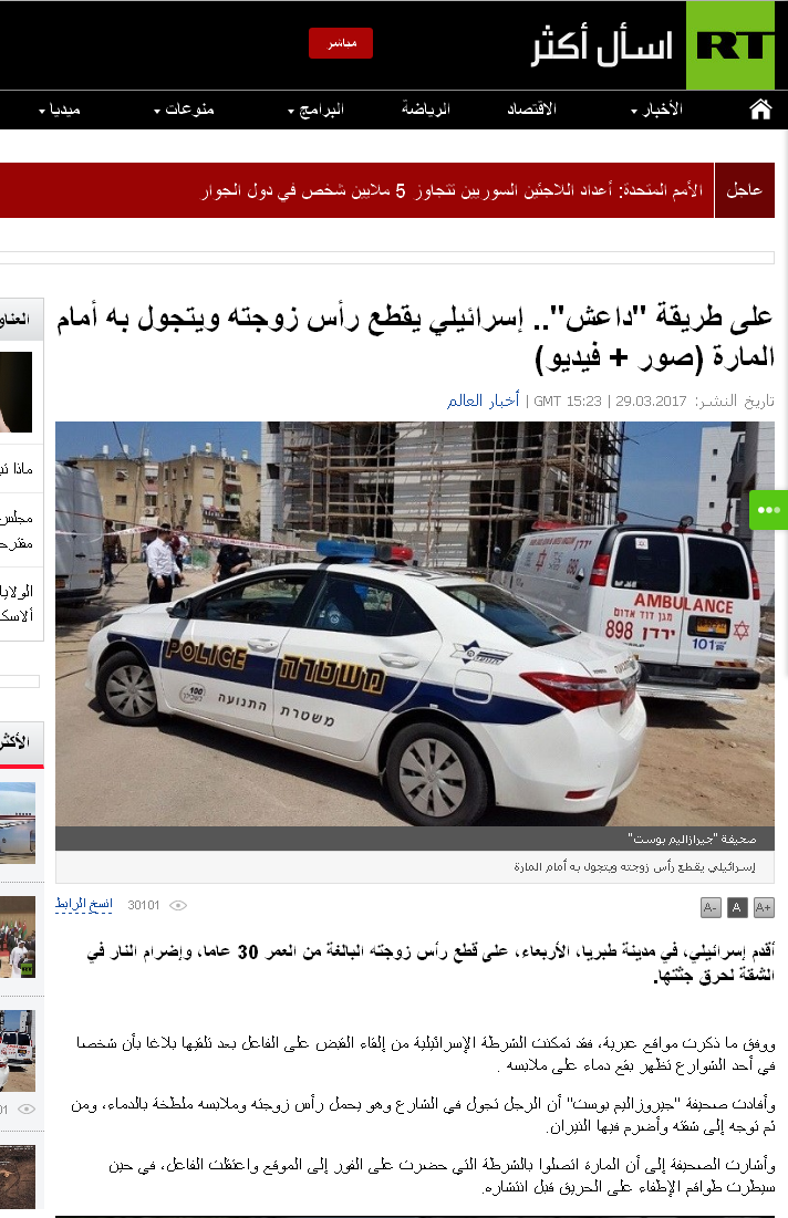 وأفادت صحيفة "جيروزاليم بوست" أن الرجل تجول في الشارع وهو يحمل رأس زوجته وملابسه ملطخة بالدماء، ومن ثم توجه إلى شقته وأضرم فيها النيران.