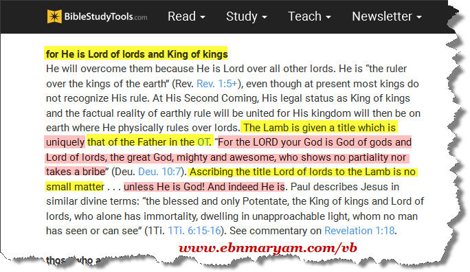 He will overcome them because He is Lord over all other lords. He is “the ruler over the kings of the earth” (Rev. Rev. 1:5+), even though at present most kings do not recognize His rule. At His Second Coming, His legal status as King of kings and the factual reality of earthly rule will be united for His kingdom will then be on earth where He physically rules over lords. The Lamb is given a title which is uniquely that of the Father in the OT. “For the LORD your God is God of gods and Lord of lords, the great God, mighty and awesome, who shows no partiality nor takes a bribe” (Deu. Deu. 10:7). Ascribing the title Lord of lords to the Lamb is no small matter . . . unless He is God! And indeed He is. Paul describes Jesus in similar divine terms: “the blessed and only Potentate, the King of kings and Lord of lords, who alone has immortality, dwelling in unapproachable light, whom no man has seen or can see” (1Ti. 1Ti. 6:15-16). See commentary on Revelation 1:18.