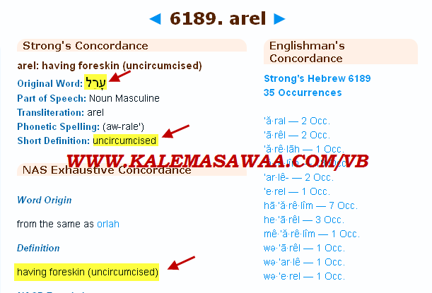 استعمال الكلمة في لاويين 26:41 ( النصّ العبري ) لا يعدو مجرّد مجاز أو تشبيه بعكس إستعمال الكلمة في إشعياء 52:1 اللي هو استعمال حقيقي . ترجمات عربية أخرى لذات العدد لم تستعمل نفس الكلمة : لاويين 26 :41 أخبار سارة بحيث تماديت أنا أيضا في مخالفتهم، فأدخلتهم أرض أعدائهم حتى تخضع قلوبهم الكافرة ويتحملوا جزاء آثامهم حياة : التي جعلتني أنقلب عليهم وأنفيهم إلى أرض أعدائهم، وإن خضعت قلوبهم النجسة بعد أن استوفوا عقاب خطاياهم، ![]() المنصّر البائس يُحاول أن يُفهمنا أنّ أغلف الواردة في بشارة إشعياء معناها غير مختون ! أشكّ أنه قرأ يوما نص تكوين 17 : 14 الذي يقول : وَأَمَّا الذَّكَرُ الأَغْلَفُ الَّذِي لاَ يُخْتَنُ فِي لَحْمِ غُرْلَتِهِ فَتُقْطَعُ تِلْكَ النَّفْسُ مِنْ شَعْبِهَا. إِنَّهُ قَدْ نَكَثَ عَهْدِي أحياناً التناقض يورد صاحبه مورد التهلكة ! ![]() أذكّر المنصرَ بنص كلامه :