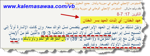 إن الله لا يضع وصاياه عبثًا، ولا يتغير في تعليمه. إن الله لا يضع وصاياه عبثًا، ولا يتغير في تعليمه. إن الله لا يضع وصاياه عبثًا، ولا يتغير في تعليمه. إن الله لا يضع وصاياه عبثًا، ولا يتغير في تعليمه. إن الله لا يضع وصاياه عبثًا، ولا يتغير في تعليمه. إن الله لا يضع وصاياه عبثًا، ولا يتغير في تعليمه. ![]() هل قرأتَ و إستوعبتَ جيّداًً هذه الجملة يا تابع بولس ؟؟؟ الدّليل الثاني : من تعاليم بولس واضع لبِنَة المسيحية نقرأ : كولوسي 2 : 11 وَبِهِ أَيْضًا خُتِنْتُمْ خِتَانًا غَيْرَ مَصْنُوعٍ بِيَدٍ، بِخَلْعِ جِسْمِ خَطَايَا الْبَشَرِيَّةِ، بِخِتَانِ الْمَسِيحِ. في التفسير المصاحب بقلم بنيامين بنكرتن :
