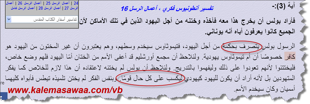 المنصّر البائس يريد أن يدلّس من خلال قصّة ختان تيموثاوس ! ختن بولس ( عدوّ طقس الختان ) لتيموثاوس كان من باب مُحاباة لليهود ومحاولة ضمّهم لباقي قطيع يسوع و النص كان واضح و بليغ في النقطة دية إذ قال : " وَخَتَنَهُ مِنْ أَجْلِ الْيَهُودِ الَّذِينَ فِي تِلْكَ الأَمَاكِنِ " ! الكلام ده من كيسي ؟؟؟ لا بالطبع ! إقرأ ما خطّه قلم القس أنطونيوس فكري :
