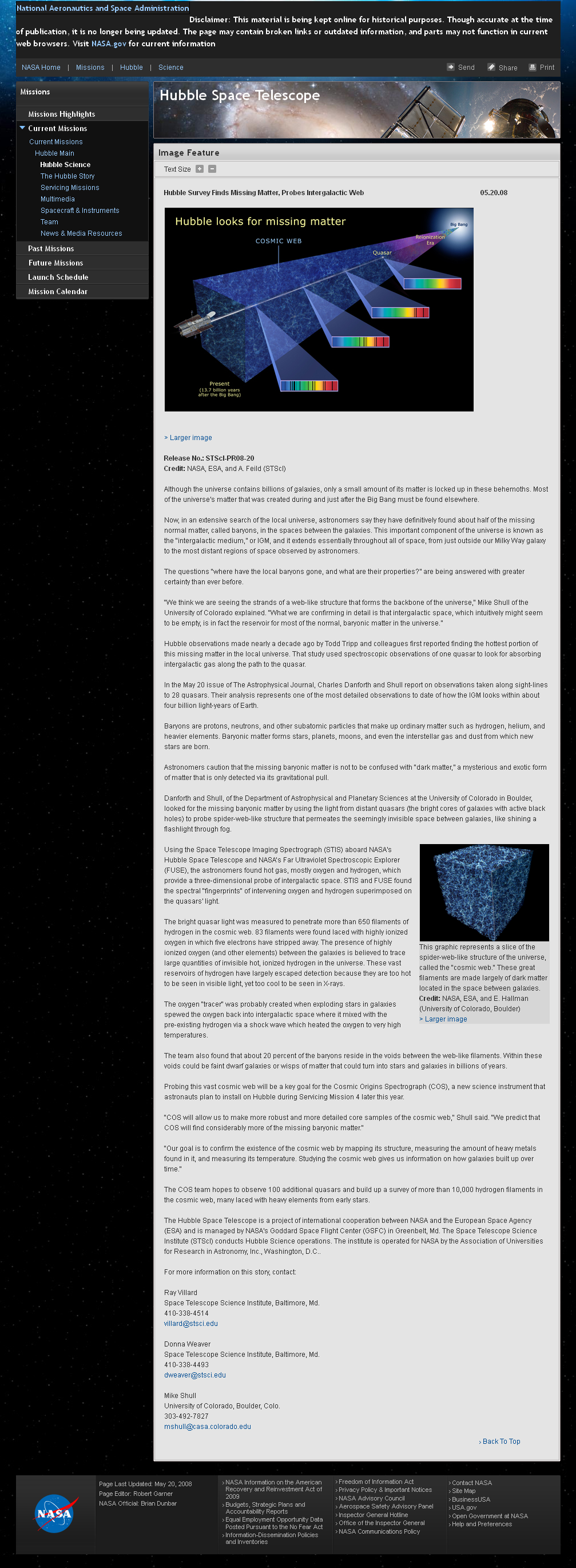 الرسم يُمثّل جزءا من بنية الكون التي تُشبه الشّبكة العنكبوتية و التي يُطلق عليه اسم " النسيج الكوني " !!! ![]() هذه الخيوط الكبيرة هي مصنوعة من المادة المظلمة الموجودة في الفضاء بين المجرّات !!! ![]() المصدر : https://www.nasa.gov وكالة الفضاء الأميركية في حديثها عن بنية الكون تستعمل مصطلحات من قبيل : " نسيج " و " "خيوط " ؟؟؟؟ أمر غريب ؟؟؟ ![]() يُتبع .... للمزيد من مواضيعي