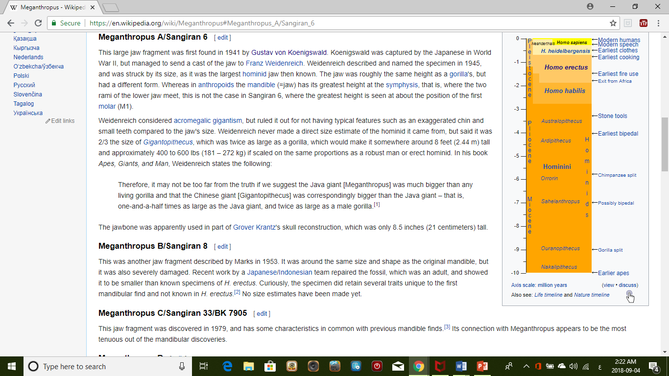 و هناك حفرية لفك تعرف باسم Meganthropus A اكتشفت أثناء الحرب العالمية الثانية يفترض أنها تنتمى لسلالة الإنسان المنتصب Homo erectus يقدر طول صاحبها ب 2 متر و 44 سم و كان هناك شك أن هذا الطول المبالغ فيه لمرض بالغدة النخامية يعرف باسم Gigantism يؤدى إلى زيادة الطول و لكن لا يوجد آثار أخرى بالفك تدل على الإصابة بهذا المرض مما يدل على أن هذا هو الطول الطبيعى لهذا الإنسان https://en.wikipedia.org/wiki/Megant...s_A/Sangiran_6 |