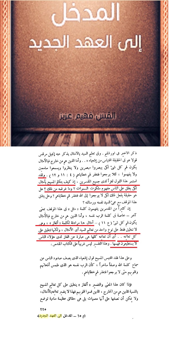 إنجيل مرقس 4 1 وَابْتَدَأَ أَيْضًا يُعَلِّمُ عِنْدَ الْبَحْرِ، فَاجْتَمَعَ إِلَيْهِ جَمْعٌ كَثِيرٌ حَتَّى إِنَّهُ دَخَلَ السَّفِينَةَ وَجَلَسَ عَلَى الْبَحْرِ، وَالْجَمْعُ كُلُّهُ كَانَ عِنْدَ الْبَحْرِ عَلَى الأَرْضِ. 2 فَكَانَ يُعَلِّمُهُمْ كَثِيرًا بِأَمْثَال. وَقَالَ لَهُمْ فِي تَعْلِيمِهِ: «اسْمَعُوا! هُوَذَا الزَّارِعُ قَدْ خَرَجَ لِيَزْرَعَ، 4 وَفِيمَا هُوَ يَزْرَعُ سَقَطَ بَعْضٌ عَلَى الطَّرِيقِ، فَجَاءَتْ طُيُورُ السَّمَاءِ وَأَكَلَتْهُ. 5 وَسَقَطَ آخَرُ عَلَى مَكَانٍ مُحْجِرٍ، حَيْثُ لَمْ تَكُنْ لَهُ تُرْبَةٌ كَثِيرَةٌ، فَنَبَتَ حَالًا إِذْ لَمْ يَكُنْ لَهُ عُمْقُ أَرْضٍ. 6 وَلكِنْ لَمَّا أَشْرَقَتِ الشَّمْسُ احْتَرَقَ، وَإِذْ لَمْ يَكُنْ لَهُ أَصْلٌ جَفَّ. 7 وَسَقَطَ آخَرُ فِي الشَّوْكِ، فَطَلَعَ الشَّوْكُ وَخَنَقَهُ فَلَمْ يُعْطِ ثَمَرًا. 8 وَسَقَطَ آخَرُ فِي الأَرْضِ الْجَيِّدَةِ، فَأَعْطَى ثَمَرًا يَصْعَدُ وَيَنْمُو، فَأَتَى وَاحِدٌ بِثَلاَثِينَ وَآخَرُ بِسِتِّينَ وَآخَرُ بِمِئَةٍ». 9 ثُمَّ قَالَ لَهُمْ: «مَنْ لَهُ أُذُنَانِ لِلسَّمْعِ، فَلْيَسْمَعْ» 10 وَلَمَّا كَانَ وَحْدَهُ سَأَلَهُ الَّذِينَ حَوْلَهُ مَعَ الاثْنَيْ عَشَرَ عَنِ الْمَثَلِ، 11 فَقَالَ لَهُمْ: «قَدْ أُعْطِيَ لَكُمْ أَنْ تَعْرِفُوا سِرَّ مَلَكُوتِ اللهِ. وَأَمَّا الَّذِينَ هُمْ مِنْ خَارِجٍ فَبِالأَمْثَالِ يَكُونُ لَهُمْ كُلُّ شَيْءٍ، 12 لِكَيْ يُبْصِرُوا مُبْصِرِينَ وَلاَ يَنْظُرُوا، وَيَسْمَعُوا سَامِعِينَ وَلاَ يَفْهَمُوا، لِئَلاَّ يَرْجِعُوا فَتُغْفَرَ لَهُمْ خَطَايَاهُمْ». 13 ثُمَّ قَالَ لَهُمْ: «أَمَا تَعْلَمُونَ هذَا الْمَثَلَ؟ فَكَيْفَ تَعْرِفُونَ جَمِيعَ الأَمْثَالِ؟ وجاء في تفسير تادرس يعقوب مالطي هذا التسائل سادسًا: في لقاء الاثني عشر مع السيد، إذ سألوه عن المثل أجاب: "قد أُعطى لكم أن تعرفوا سرّ ملكوت الله، وأما الذين هم من خارج فبالأمثال يكون لهم كل شيء. لكي يبصروا مبصرين ولا ينظروا، ويسمعوا سامعين ولا يفهموا، لئلا يرجعوا، فتغفر لهم خطاياهم" [11-12]. وقد أثارت هذه الإجابة تساؤلات الكثير من الدارسين: كيف يكون هذا؟ ألا يريد السيد من البشرية أن تفهم تعليمه وتتمتع بخلاصه، وتنال غفران الخطايا؟ وجاء أيضاً عن هذا النص مرقس 4 ترجمة الفاندايك 12 لِكَيْ يُبْصِرُوا مُبْصِرِينَ وَلاَ يَنْظُرُوا، وَيَسْمَعُوا سَامِعِينَ وَلاَ يَفْهَمُوا، لِئَلاَّ يَرْجِعُوا فَتُغْفَرَ لَهُمْ خَطَايَاهُمْ». مرقس 4 الترجمة الكاثوليكية غاية يسوع من الأمثال مر 4-10: فلَمَّا اعتَزَلَ الجَمْع، سأَلَه الَّذينَ حَولَه معَ الاثْنَي عَشَرَ عنِ الأَمثال. مر 4-11:فقالَ لَهم: ((أَنتُم أُعطيتُم سِرَّ مَلكوتِ الله. وأَمَّا سائرُ النَّاس فكُلُّ شَيءٍ يُلقى إِلَيهِم بِالأَمثال مر 4-12:فيَنظُرونَ نَظَراً ولا يُبصِرون ويَسمَعونَ سَماعاً ولا يَفهَمون لِئَلاَّ يَرجِعوا فَيُغفَرَ لَهم)). مرقس 4 الترجمة العربية المشتركة مغزى الأمثال مر 4-10:فلمَّا كانَ على اَنفِرادٍ، سألَهُ أتباعُهُ والرُّسُلُ الإثنا عشَرَ عَنْ مَغزى الأمثالِ، مر 4-11:فقالَ لهُم: ((أنتُم أُعطِيتُم سرَّ مَلكوتِ اللهِ. وأمَّا الّذينَ مِنْ خارِجٍ فيَسمَعونَ كُلَّ شيءٍ بالأمثالِ، مر 4-12:حتّى إنَّهُم: مَهما نَظَروا لا يُبصِرونَ،ومَهما سَمِعوا لا يَفهَمونَ ، لئلاَّ يَتوبوا فتُغفَرَ لهُم خطاياهُم )). مرقس 4 الترجمة البولسية مر 4-10:ولمَّا انْفردَ سأَلَهُ الذَّينَ حَوْلَهُ، مَعَ الاثَنْي عَشَرَ، عَنِ الأَمثال. مر 4-11:فَقالَ لَهم: "أَنْتم قد أُوتيتُم أَنْ تَعْرِفوا سِرَّ مَلكوتِ اللهِ. وأَمَّا أُولئكَ، الذَّينَ في الخارجِ فكلُّ شَيءٍ لهم بأَمْثال. مر 4-12:لكَيْ يَنْظُروا نَظَرًا ولا يُبْصِروا، ويسَمْعوا سَماعًا ولا يَفْهموا، لئلاَّ يَتوبُوا فيُغْفَرَ لهم". مر 4-13:ثمَّ قالَ لهم: "أَمَا تَفْهمونَ هذا المَثَل؟ فكَيفَ إِذَنْ تَفْه