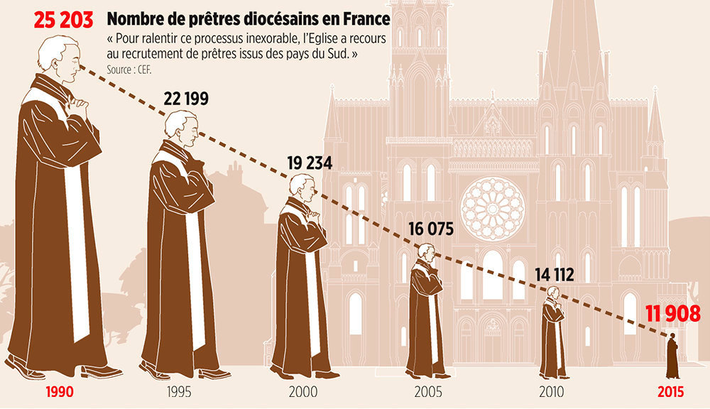 من 25203 سنة 1990 إلى --------------> 11908 سنة 2015 مما دفع بالسلطات الكنسية الفرنسية إلى الإستعانة بقساوسة من دول الجنوب!
