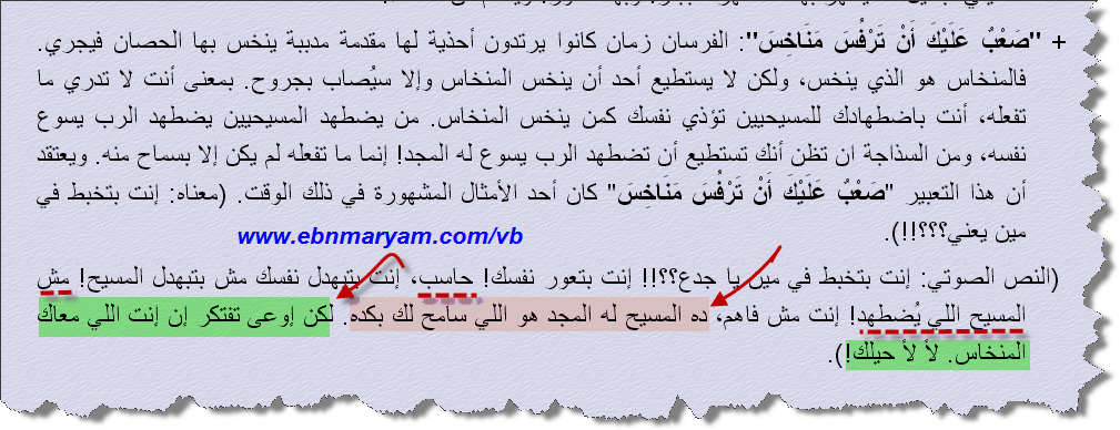 ![]() اللهم صل على محمد وعلى آله وصحبه أجمعين ،، نقرأ من أعمال الرسل أصحاح 9 عدد 5 : ..... صَعْبٌ عَلَيْكَ أَنْ تَرْفُسَ مَنَاخِسَ ![]() العبارة موضوع الدّراسة هي عبارة بذيئة ، غير لائقة نسبها زوراً و بهتاناً قلم الكَتَبَة الكَذَبَة لنبيّ كريم ، تقيّ ، ورِع ، صالح في مقام المسيح عيسى ( يسوع ) عليه السّلام . العبارة الواردة في أعمال الرسل 9 يستنكرها و يستهجنها حتى الأعاجم في الغرب لأنها تحمل معنى " صَعْبٌ عَلَيْكَ أَنْ تَعْبَثَ بِمُؤَخّرتِِي !!!! " ![]() ![]() ![]() ![]() ملاحظة: أعتذر من الجميع فقد كتبتُ العبارة أعلاه و قلمي يقطر خَجَلاً . النصّ ظاهره - الموجّه للإستهلاك - هو الحديث عن مقاومة الذين يرفضون الخضوع لمُلك المصلوب و تعاليمه لكن الحقيقة شيء آخر وهي العبارة المستهجَنة المذكورة أعلاه ! المقالُ يتضّح من خلال تفسير أبوهم القمّص داود لمعي المتكلّم بإلهام وإرشاد و توجيه من الرّوح القُدُس :