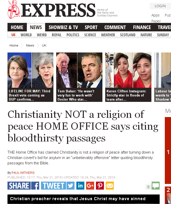 THE home office has claimed christianity is not a religion of peace after turning down a Christian covert’s bid for asylum in an “unbelievably offensive” letter quoting bloodthirsty passages from the Bible.