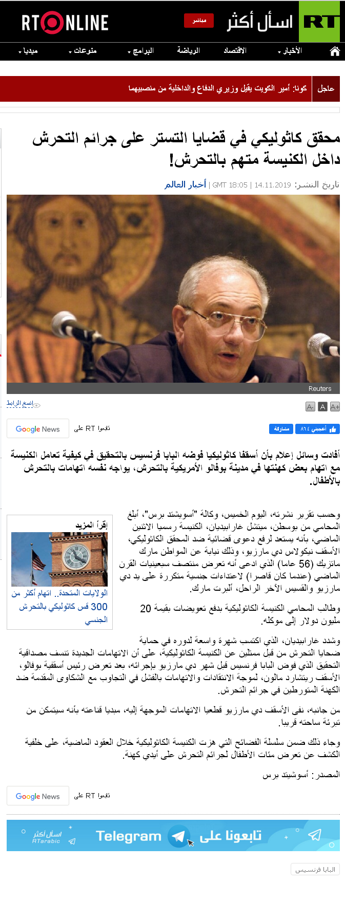 ![]() اللهم صل على محمد وعلى آله وصحبه أجمعين ،، محقق كاثوليكي في قضايا التستر على جرائم التحرش داخل الكنيسة متهم بالتحرش! ![]() أفادت وسائل إعلام بأن أسقفا كاثوليكيا فوضه البابا فرنسيس بالتحقيق في كيفية تعامل الكنيسة مع اتهام بعض كهنتها في مدينة بوفالو الأمريكية بالتحرش، يواجه نفسه اتهامات بالتحرش بالأطفال. وحسب تقرير نشرته، اليوم الخميس، وكالة "أسويشتد برس"، أبلغ المحامي من بوسطن، ميتشل غارابيديان، الكنيسة رسميا الاثنين الماضي، بأنه يستعد لرفع دعوى قضائية ضد المحقق الكاثوليكي، الأسقف نيكولاس دي مارزيو، وذلك نيابة عن المواطن مارك ماتزيك (56 عاما) الذي ادعى أنه تعرض منتصف سبعينيات القرن الماضي (عندما كان قاصرا) لاعتداءات جنسية متكررة على يد دي مارزيو والقسيس الآخر الراحل، ألبرت مارك. وطالب المحامي الكنيسة الكاثوليكية بدفع تعويضات بقيمة 20 مليون دولار إلى موكله. وشدد غارابيديان، الذي اكتسب شهرة واسعة لدوره في حماية ضحايا التحرش من قبل ممثلين عن الكنيسة الكاثوليكية، على أن الاتهامات الجديدة تنسف مصداقية التحقيق الذي فوض البابا فرنسيس قبل شهر دي مارزيو بإجرائه، بعد تعرض رئيس أسقفية بوفالو، الأسقف ريتشارد مالون، لموجة الانتقادات والاتهامات بالفشل في التجاوب مع الشكاوى المقدمة ضد الكهنة المتورطين في جرائم التحرش. من جانبه، نفى الأسقف دي مارزيو قطعيا الاتهامات الموجهة إليه، مبديا قناعته بأنه سيتمكن من تبرئة ساحته قريبا. وجاء ذلك ضمن سلسلة الفضائح التي هزت الكنيسة الكاثوليكية خلال العقود الماضية، على خلفية الكشف عن تعرض مئات الأطفال لجرائم التحرش على أيدي كهنة. المصدر: روسيا اليوم عربي للمزيد من مواضيعي
