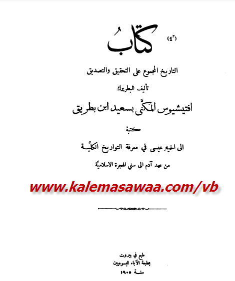 ![]() اللهم صل على محمد وعلى آله وصحبه أجمعين ،، ملاخي 2 : 7 لأَنَّ شَفَتَيِ الْكَاهِنِ تَحْفَظَانِ مَعْرِفَةً، وَمِنْ فَمِهِ يَطْلُبُونَ الشَّرِيعَةَ، لأَنَّهُ رَسُولُ رَبِّ الْجُنُودِ. -------- الحِبر المسيحي يضبط البوصلة و يُفيد في كتابه بأنّ إسماعيل عليه السّلام و نسله سكنوا المنطقة الممتدة مابين يثرب ( المدينة المنورة الحالية ) شمالاً و اليمن جنوباً ! نقرأ من : كتاب التاريخ المجموع على التحقيق والتصديق تأليف البطريرك افتيشيوس المُكنّى بسعيد إبن بطريق صفحة رقم : 22 لتحميل الكتاب يُرجى فضلاً النّقر هُنا للمزيد من مواضيعي