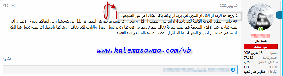 ![]() اللهم صل على محمد وعلى آله وصحبه أجمعين ــ روميّة 3 : 7 فَإِنَّهُ إِنْ كَانَ صِدْقُ اللهِ قَدِ ازْدَادَ بِكَذِبِي لِمَجْدِهِ، فَلِمَاذَا أُدَانُ أَنَا بَعْدُ كَخَاطِئٍ؟ أدناه جواب مدير أحد المنتديات المسيحية على سؤال طرحه أحد أعضاء المستنقع التنصيري و الذي مارس خلاله التضليل و الكذب فنفى جملة و تفصيلاً وجود حدّ الردّة في المسيحية . ![]() سنرى حسب قول المنصّر و الكذّاب الأشر و بالدّليل الكتابي من هي فعلاً العقيدة الهمجية التي تنتهك حقوق الإنسان و تُمارس أفكاراً منحطّة تُقفل من خلالها قلوب و عقول تابعيها بهدف تخويفهم و إبقائهم عبيداً تحت حِجْر العقيدة الوثنيّة الفاسدة ، فأعرني سمعك يا عابد الإنسان ! نقرأ من سفر تثنية الإشتراع ، أصحاح 13 ، عدد 1 - 10 إِذَا قَامَ فِي وَسَطِكَ نَبِيٌّ أَوْ حَالِمٌ حُلْمًا، وَأَعْطَاكَ آيَةً أَوْ أُعْجُوبَةً، وَلَوْ حَدَثَتِ الآيَةُ أَوِ الأُعْجُوبَةُ الَّتِي كَلَّمَكَ عَنْهَا قَائِلاً: لِنَذْهَبْ وَرَاءَ آلِهَةٍ أُخْرَى لَمْ تَعْرِفْهَا وَنَعْبُدْهَا، فَلاَ تَسْمَعْ لِكَلاَمِ ذلِكَ النَّبِيِّ أَوِ الْحَالِمِ ذلِكَ الْحُلْمَ، لأَنَّ الرَّبَّ إِلهَكُمْ يَمْتَحِنُكُمْ لِكَيْ يَعْلَمَ هَلْ تُحِبُّونَ الرَّبَّ إِلهَكُمْ مِنْ كُلِّ قُلُوبِكُمْ وَمِنْ كُلِّ أَنْفُسِكُمْ. وَرَاءَ الرَّبِّ إِلهِكُمْ تَسِيرُونَ، وَإِيَّاهُ تَتَّقُونَ، وَوَصَايَاهُ تَحْفَظُونَ، وَصَوْتَهُ تَسْمَعُونَ، وَإِيَّاهُ تَعْبُدُونَ، وَبِهِ تَلْتَصِقُونَ. وَذلِكَ النَّبِيُّ أَوِ الْحَالِمُ ذلِكَ الْحُلْمَ يُقْتَلُ، لأَنَّهُ تَكَلَّمَ بِالزَّيْغِ مِنْ وَرَاءِ الرَّبِّ إِلهِكُمُ الَّذِي أَخْرَجَكُمْ مِنْ أَرْضِ مِصْرَ، وَفَدَاكُمْ مِنْ بَيْتِ الْعُبُودِيَّةِ، لِكَيْ يُطَوِّحَكُمْ عَنِ الطَّرِيقِ الَّتِي أَمَرَكُمُ الرَّبُّ إِلهُكُمْ أَنْ تَسْلُكُوا فِيهَا. فَتَنْزِعُونَ الشَّرَّ مِنْ بَيْنِكُمْ. وَإِذَا أَغْوَاكَ سِرًّا أَخُوكَ ابْنُ أُمِّكَ، أَوِ ابْنُكَ أَوِ ابْنَتُكَ أَوِ امْرَأَةُ حِضْنِكَ، أَوْ صَاحِبُكَ الَّذِي مِثْلُ نَفْسِكَ قَائِلاً: نَذْهَبُ وَنَعْبُدُ آلِهَةً أُخْرَى لَمْ تَعْرِفْهَا أَنْتَ وَلاَ آبَاؤُكَ مِنْ آلِهَةِ الشُّعُوبِ الَّذِينَ حَوْلَكَ، الْقَرِيبِينَ مِنْكَ أَوِ الْبَعِيدِينَ عَنْكَ، مِنْ أَقْصَاءِ الأَرْضِ إِلَى أَقْصَائِهَا، فَلاَ تَرْضَ مِنْهُ وَلاَ تَسْمَعْ لَهُ وَلاَ تُشْفِقْ عَيْنُكَ عَلَيْهِ، وَلاَ تَرِقَّ لَهُ وَلاَ تَسْتُرْهُ، بَلْ قَتْلاً تَقْتُلُهُ. يَدُكَ تَكُونُ عَلَيْهِ أَوَّلاً لِقَتْلِهِ، ثُمَّ أَيْدِي جَمِيعِ الشَّعْبِ أَخِيرًا. تَرْجُمُهُ بِالْحِجَارَةِ حَتَّى يَمُوتَ، لأَنَّهُ الْتَمَسَ أَنْ يُطَوِّحَكَ عَنِ الرَّبِّ إِلهِكَ الَّذِي أَخْرَجَكَ مِنْ أَرْضِ مِصْرَ مِنْ بَيْتِ الْعُبُودِيَّةِ. ![]() من ذات السّفر و الأصحاح نقر أيضاً : 12- إِنْ سَمِعْتَ عَنْ إِحْدَى مُدُنِكَ الَّتِي يُعْطِيكَ الرَّبُّ إِلهُكَ لِتَسْكُنَ فِيهَا قَوْلاً: 13- قَدْ خَرَجَ أُنَاسٌ بَنُو لَئِيمٍ مِنْ وَسَطِكَ وَطَوَّحُوا سُكَّانَ مَدِينَتِهِمْ قَائِلِينَ: نَذْهَبُ وَنَعْبُدُ آلِهَةً أُخْرَى لَمْ تَعْرِفُوهَا. 14-وَفَحَصْتَ وَفَتَّشْتَ وَسَأَلْتَ جَيِّدًا وَإِذَا الأَمْرُ صَحِيحٌ وَأَكِيدٌ، قَدْ عُمِلَ ذلِكَ الرِّجْسُ فِي وَسَطِكَ، 15- فَضَرْبًا تَضْرِبُ سُكَّانَ تِلْكَ الْمَدِينَةِ بِحَدِّ السَّيْفِ، وَتُحَرِّمُهَا بِكُلِّ مَا فِيهَا مَعَ بَهَائِمِهَا بِحَدِّ السَّيْفِ. 16 - تَجْمَعُ كُلَّ أَمْتِعَتِهَا إِلَى وَسَطِ سَاحَتِهَا، وَتُحْرِقُ بِالنَّارِ الْمَدِينَةَ وَكُلَّ أَمْتِعَتِهَا كَامِلَةً لِلرَّبِّ إِلهِكَ، فَتَكُونُ تَلاًّ إِلَى الأَبَدِ لاَ تُبْنَى بَعْدُ. ![]() من العهد الجديد نقرا أيضاً : عبرانيين 10 : 28 مَنْ خَالَفَ نَامُوسَ مُوسَى فَعَلَى شَاهِدَيْنِ أَوْ ثَلاَثَةِ