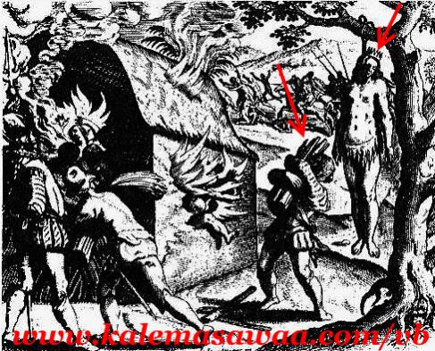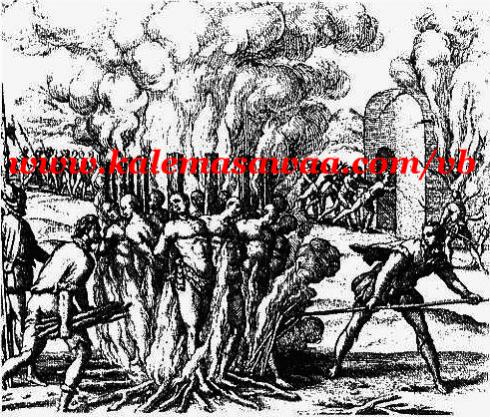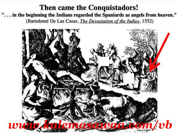 صورة جندي اسباني يحمل بيديه طفلين بريئين يُريد تحطيم جمجمتيهما على الصخر، لاحظوا أيضا طريقة شنق الهنود ، أصابع تكاد تلمس الأرض ، امعانا في التعذيب قبل الموت ، تماما كما جاء في شهادة القس دو لاس كاساس : ![]() أيدي تُقطع دون أدنى رحمة : ![]() نساء وأطفال يُدفنون أحياء : ![]() الزعماء الهنود يتم استدراجهم بدهاء الحياّت ومكر الثعالب ، يُشنقون ، و يُحرقون : ![]() لا تستغربوا ، فكل ذلك القتل الوحشي كان بمشيئة ومُباركة ( الرب) يسوع !!!! ![]() ((( أقتلوا للهلاك ))) "اَلشَّيْخَ وَالشَّابَّ وَالْعَذْرَاءَ وَالطِّفْلَ وَالنِّسَاءَ، اقْتُلُوا لِلْهَلاَكِ " ( حزقيال : 9:6 ) ![]() المزيد من مواضيعي